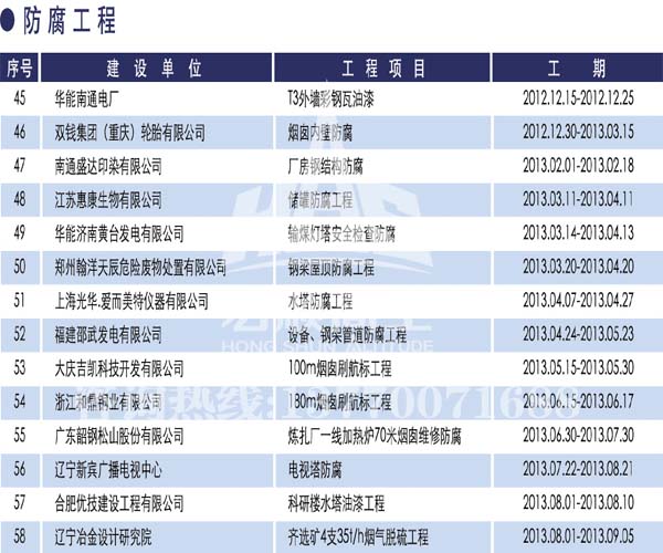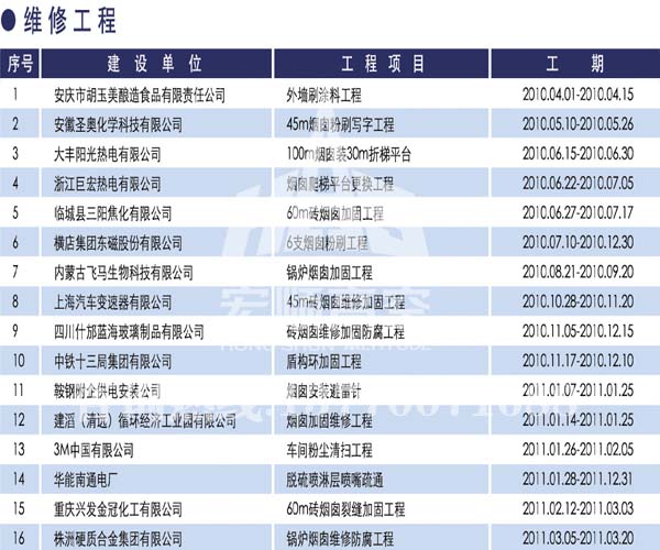 宏順建設(shè)工程有限公司是國(guó)家批準(zhǔn)成立的專業(yè)高空作業(yè)企業(yè):承攬過(國(guó)內(nèi).國(guó)外)煙囪新建、煙囪防腐、吊機(jī)防腐、水塔防腐、管道防腐、龍門吊防腐、儲(chǔ)存罐防腐、煙囪內(nèi)壁防腐等高空作業(yè)工程。具有“不搭腳手架 、 不需要停產(chǎn)”施工特點(diǎn)。